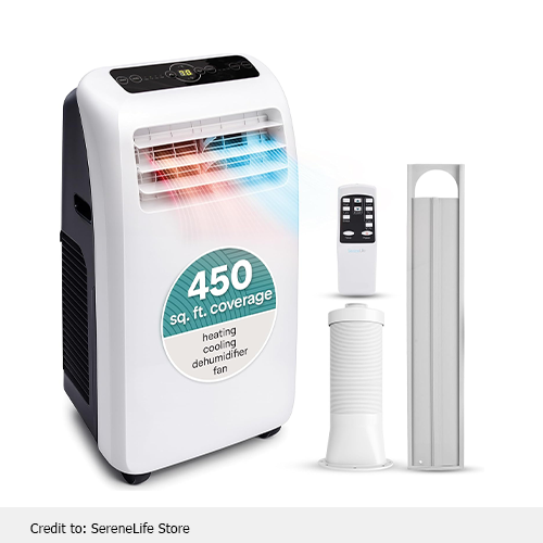 SereneLife’s quiet portable AC has core functions, is normally used in offices and homes, and is easy to move. It is controlled by a remote that features a digital touch-button control panel that includes the settings of power, timer, temperature, mode, and speed of the fan. This unit not only produces coolness but also minimizes humidity levels. In the winter season, this unit can be used like a heater to minimize the cold.