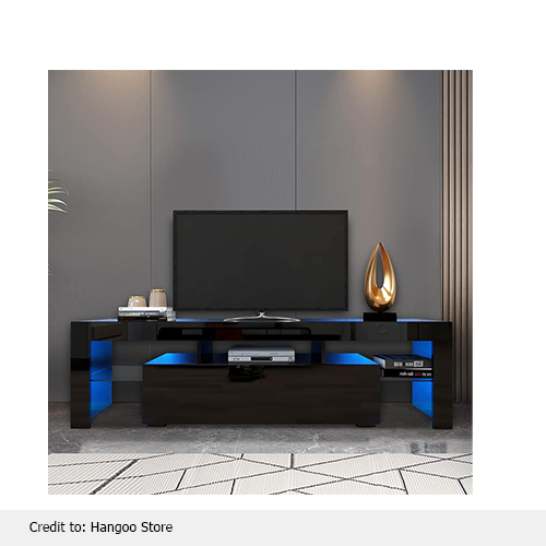 For those who are cast around to enhance their viewing experience, the Hangoo LED TV stand is a perfect match for them. This TV stand is more than just an article of furniture. It’s an ambiance creator for your room. The Universal wood TV stand is suitable for both wall-mounted and vertical-type TVs and is perfect for 50” to 70′‘ televisions. Adjustable lighting can complement your entertainment area. High-quality built-in LED remote control lights with four different modes to set a vibe according to your mood. Enough to energize your living experience, brightness level, and different color modes are two of the standouts for that.