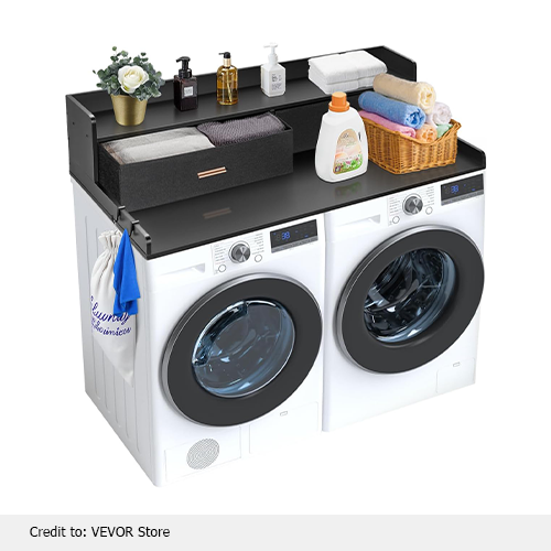 The VEVOR produced a black washer and dryer countertop design with additional features. In this design, the facility of two built-in drawers is available. They can help you to organize your washing chores more conveniently and easily. For example, you cs put items such as clips, clotheslines, and socks. An additional facility is the side-by-side hook, which is perfect for hanging casual, small items. Indeed, it is an incredible craft piece for you to keep, and everything is comfortable and accessible anytime without going away. You can keep your clothes by folding them just after fine drying.