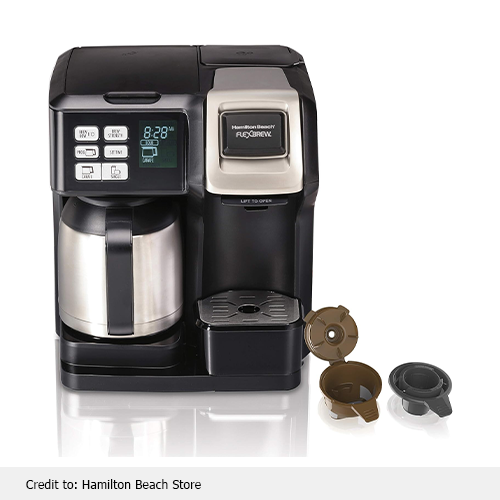 Hamilton Beach coffee maker uses a K-Cup pod/ground coffee to make one cup, or use your preferred ground coffee to make up to ten cups. With a pod, you may make up to a ten-ounce one-cup, or you can use coffee grounds to brew coffee into a 14-ounce 7-inch travel mug. This coffee maker with K cup combo is fully automatic and uses a paper filter.