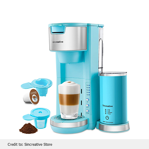 Just slide the drip tray to accommodate your cup or mug. The Sincreative coffee maker allows for several brews and larger cups thanks to the 30-ounce removable water reservoir, and it makes beverages in about 2 to 3 minutes. Uses reusable filters or K-Cups to make your preferred tea leaves or coffee grounds. It features a milk frother and adds milk foam on the top of coffee.