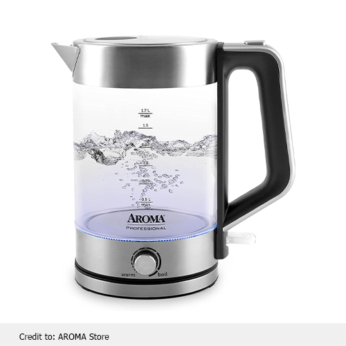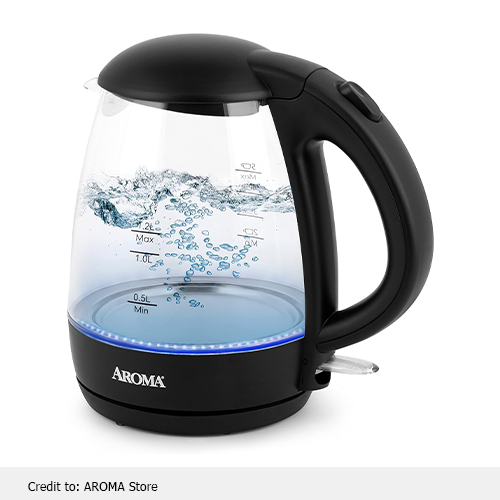 An Aroma glass electric kettle makes boiling water simple and fast. Also, you can make oatmeal noodles, something tea, and much more with the Aroma kettle. By pressing a button, you will have boiled water ready at a fast cup-per-minute rate. One of its biggest advantages is that you don’t need to stress out about forgetting it like a pot on the stove; this kettle will automatically shut off.