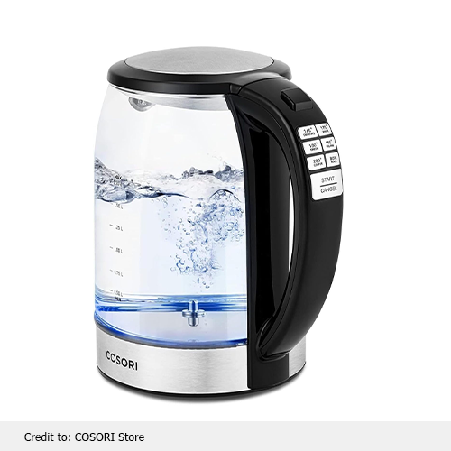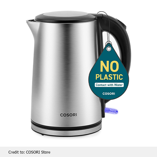 There’s zero contact of boiling water with plastic in Cosori kettlers. They are crafted with borosilicate glass and stainless steel, which ensures the purity and safety of your boiling water.