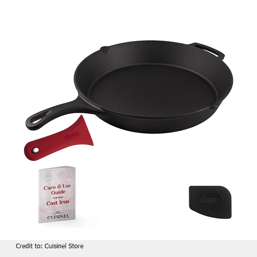 The Cuisinel’s 15 inch cast iron skillet is designed to evenly distribute heat and last a lifetime. It keeps heat even, which keeps flavors in and makes every meal rich and tasty. Always gives the same results whether you cook on a stove, oven, grill, or campfire. The strong assist-loop handle on this black frying pan makes it easy to lift and control. Moreover, this pan features pour spouts on both sides that make it easy to move sauces around. With ease, you can sear meats, bake casseroles, fry eggs, or grill veggies in it. Because it is made of high-quality cast iron, it is very durable.