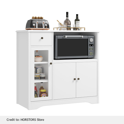 You should choose the HORSTORS microwave drawer cabinet for your kitchen to keep things organized. It gives a clean and aesthetic look to your kitchen. It comes with a drawer, multiple shelves and two cupboards. You can keep kitchen tools in an open space like toaster oven, microwaves or juicer. A small drawer can hold small items like forks, spoons, knives, napkins, and other items.
