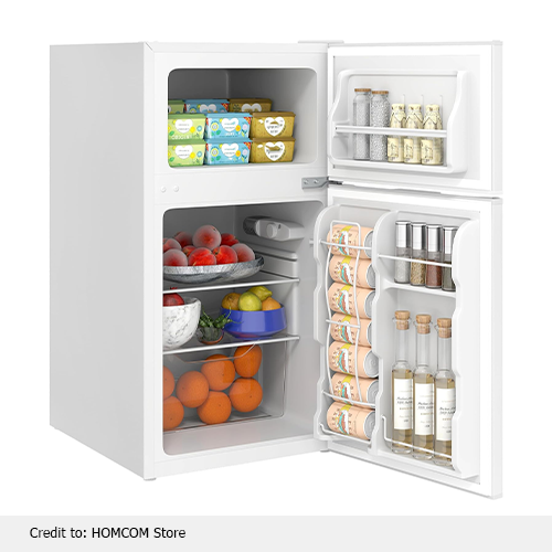 HOMCOM mini fridge with freezer combines cooling and freezing in a single appliance. It is equipped with a separate freezer compartment and storage inside the door, on shelves, and a crisper drawer. You can organize the food items nicely and easily. The small fridge is designed to fit where limited space is available. So, it is ideal for small apartments or small rooms. It is important to keep everything at the right temperature, which is easy with the five-level setting of the adjustable thermostat.