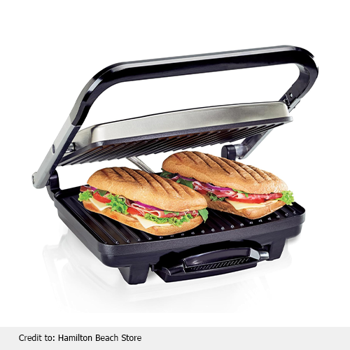 Enhance your grilling experience with Hamilton’s best panini press. This is not just a panini maker but an electric grill with tons of features. This incredible sandwich maker is equipped with a top and bottom grill, which means this sandwich maker grills a sandwich in less than 10 minutes, so you can enjoy a restaurant-style meal in much less time. Its compact design makes it easier to store; you can store it flat or upright.