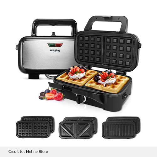 Make perfect crispy waffles with Metine’s best panini press. This appliance comes with switchable 3 plates for different uses. You can use a grill plate for grilling chops, veggies, steaks, corn, potatoes, and even panini. Use a sandwich plate for delicious sandwiches, and bread toasters, also with a waffle plate, you can enjoy yummy crispy waffles. Moreover, its powerful 1200-w motor makes its performance incredible.
