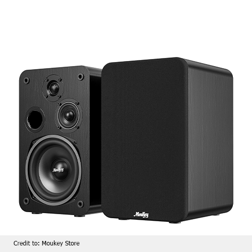 Moukey bookshelf speakers deliver a great, clear sound. These speakers have 3 different parts: woofer, mid-range, and tweeter. High frequency is harsh, but not so harsh that it makes you uncomfortable. Middle frequency handles instruments and vocals, and Low frequency is responsible for the clear, soft, and strong sound. Furthermore, these mount speakers are made up of wood that is strong and modern to make the sound durable and reduce unwanted sounds. They have hooks on the back that make it possible for you to hang them on the wall, making the sound more enjoyable.