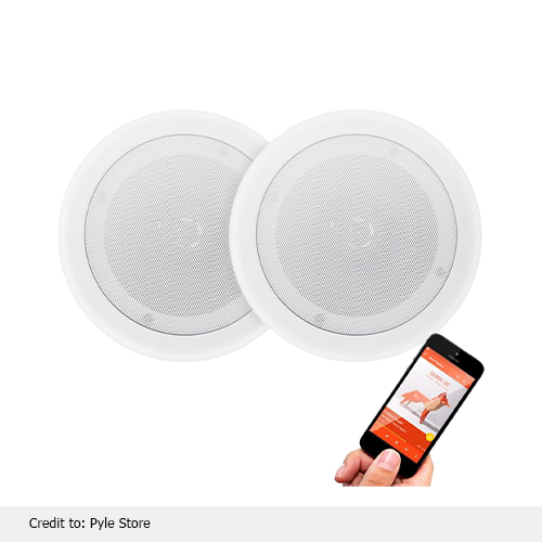 Pyle’s Bluetooth ceiling speakers system allows you to play music without wires all over the room. It comes with round and square easy-to-clean speaker covers, allowing users to select a design that fits any interior. The system’s flush-mounted structure adds a stylish look without taking up extra space. The wall-mounted 2-way speaker delivers high-quality audio output and serves home theatres, music systems, and custom installations well. Listeners will experience perfect sound clarity and the best audio quality from the multi-channel sound. Moreover, these speakers deliver a 200-watt power output and support Bluetooth connectivity to connect devices to these speakers.