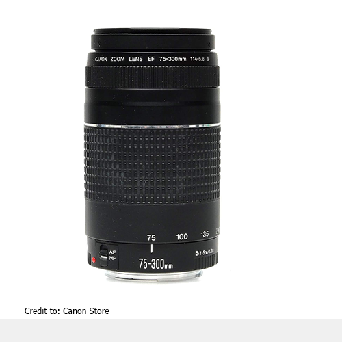 A silver ring is used for the zoom ring on the front side of the camera. The telephoto lens is 75-300 mm with an f/4-5.6 opening for the lenses of these SLR cameras from Canon. The telephoto lens is developed to win the EF75-300mm f/4-5.6 II, and the body of the camera is lightweight, which makes it easier to hold and capture moments.