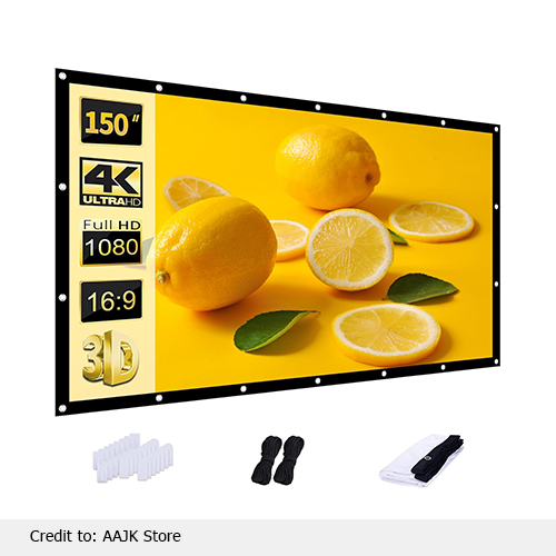 AAJK 150-inch Projector Screen is made of spandex, which is smooth and thickened. This movie projector is compact, lightweight, and easy to fold and wash. It is used for indoor and outdoor events, with 20 hooks to set it on the wall for indoors and a 2*4-meter rope for outdoor events. There is no need to worry about crowding, as it provides a wide field of view, a viewing angle of 180 degrees, and prevents vision fatigue. We like the quality, ease of setup, and performance of the projection screen. It is easy to hang out and works well for outdoor movie nights.