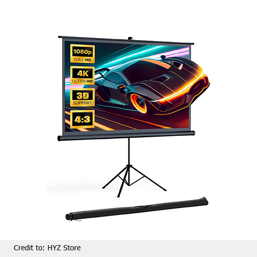 This 4K projector screen is wrinkle-free and offers effortless cleaning. It provides better results when watching your favorite movies by prohibiting yellow staining. It takes a few minutes to install and set up easily and does not need screws. Its components are smashable and should be handled carefully. This projector provides clear, less reflective, and excellent picture quality, and contains a sturdy triangular adjustable stand that gives excellent stability to the screen and a bag to protect the tripod and screen from dust.